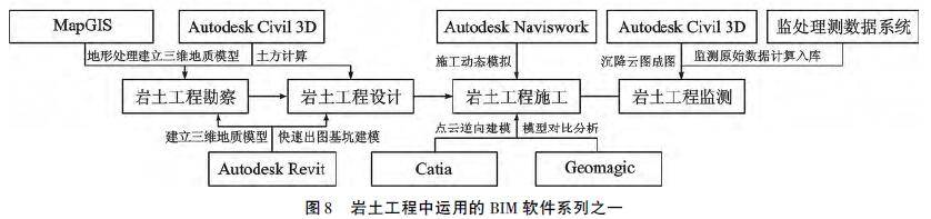 BIM并不是一个软件的事,严格地说BIM不是一类软件的事,而且每一类软件的选择也不止是一个产品。要充分发挥BIM价值为项目创造效益,涉及常用的BIM软件数量就有十几个到几十个之多。这对技术人员的软件熟悉程度和操作能力有着较高的要求,合理选择BIM软件,通过不同的软件组合实现理想的工程目的成为关键。以下为岩土工程中各阶段所用到的BIM软件系列之一,如图8所示。