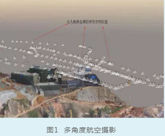 实景三维建模技术的原理为:分析从不同视点拍摄静态对象的若干照片,自动检测对应物理点像素,从而推断照片相对取向和场景准确三维形状,生成更具有精细结构的三维模型 以大疆无人机PHANTOM 3 PROFESSIONAL为例,在飞行平台上安装1个镜头,在飞行过程中从多角度利用控制器使镜头始终对焦于目标区域,如图1所示。目标区域各个方位均被拍摄,使拍摄区域生成多角度影像从而真实反映出目标物的空间位置关系。