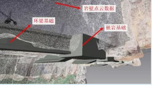 项目施工中,如何确定岩壁与构筑物之间的碰撞一直是困扰设计单位和施工单位的一个重难点问题。实景三维模型结合构筑物BIM模型,能更好地为岩壁切割提供与现场相关度极高的数据支撑,并确定相关岩壁切割范围,从而形成结合施工现场的施工技术方案。构筑物与岩壁碰撞情况如图7所示。