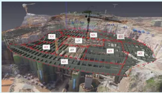 在施工建造过程中,很难清晰地了解整个项目的宏观进度情况,特别是在施工区域庞大的基础设施项目中。传统做法是通过现场影像资料对整个项目进行管理,但静态照片只能表示项目局部信息。在利用实景三维建模技术后,将BIM信息模型整合至实景模型中,能清晰地了解项目建设情况,为下一步施工部署及项目管理提供数据支撑。针对整个平台做分区划分,通过实景模型与BIM模型的叠合,不仅可以了解项目进度,同时也可规划下一步进度推进工作。平台划分如图8所示。