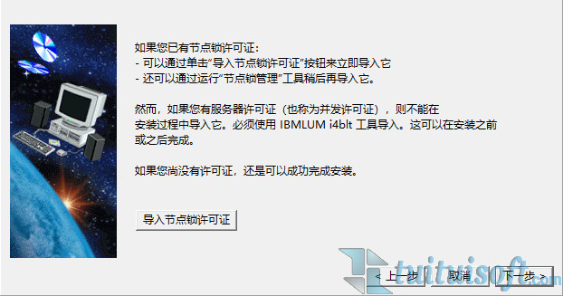 点击下一步之后会出现"节点许可证"的对话框,若是有服务器许可证的不能在安装的过程中导入,需要用“IBMLUMi4blt”工具进行导入,若是没有服务器没有许可证的还是可以安装的。