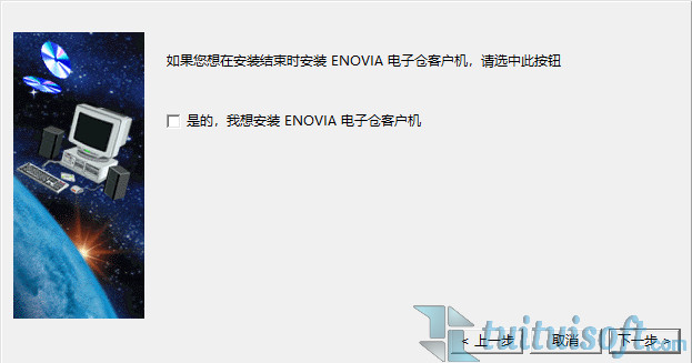 以下是“电子仓客户机配置”的对话框,为了保证达索系列软件安装的完整性,这里需要勾选“是的,我想安装ENOVIA电子仓客户机”