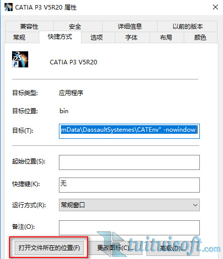 接着回到电脑的桌面当中,选择catia的图标鼠标左键选择“属性”,在属性的对话框当中选择“打开文件所在的位置”,进入到catia的根目录当中