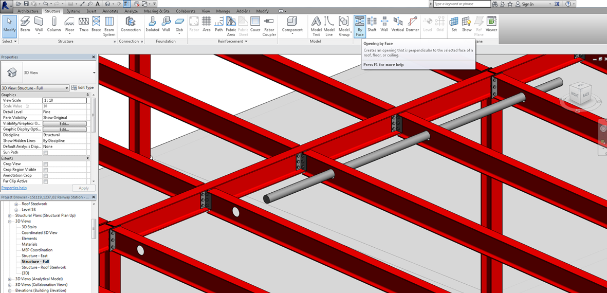 现有工作流程的问题:设计师在Autocad里面出设计图,深化单位在Autocad里面绘制深化设计图,比较先进的深化设计单位或者比较复杂的项目可能用详图设计软件重建3D模型。新的工作流程避免了以往不连续配合中的问题:详图工程师未正确理解设计意图导致节点深化错误;构件截面,长度,材质等搞错;结构设计图纸遗漏了建筑及机电设计师的开洞(例如下图);当然最棒的是大家在同一个模型上进行配合,详图工程师不必再另起炉灶,花费很大精力重建一个3D钢结构模型,只需集中精力完善设计中未明确部分。