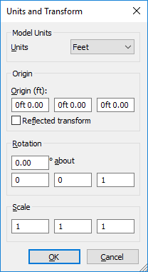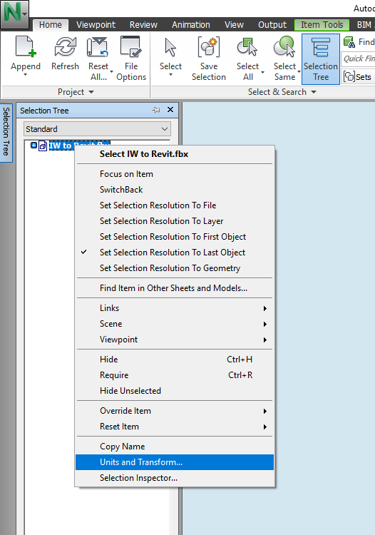 在 Navisworks 中打开 FBX 模型。Navisworks 模型的单位必须与从 InfraWorks 导出的 FBX 的单位匹配。要更改 Navisworks 中的单位,请从“选择树”中选择模型,右键单击该模型并选择“单位和变换”。确认 X、Y 和 Z 坐标与第 1 步中的坐标相同。