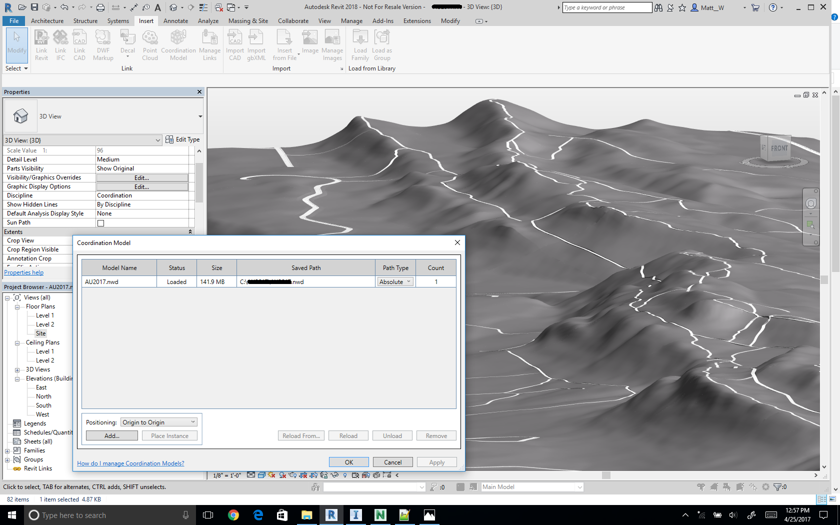 通过获取场地平面 DWG 的坐标(其坐标系与 InfraWorks 模型的坐标系相同),对 Revit 模型进行地理定位。确保场地平面 DWG 和 InfraWorks 模型具有相同坐标系的一个好方法是,直接在 Civil 3D 中打开 InfraWorks 模型。