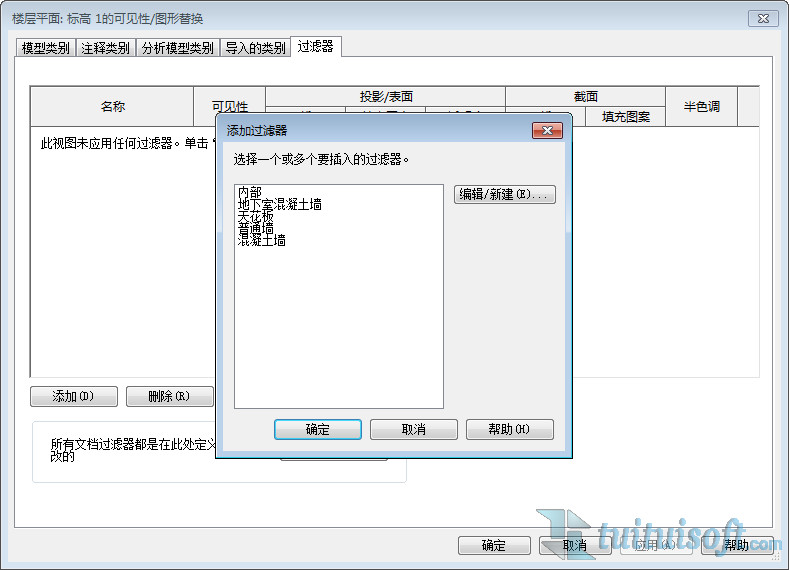 过滤器的触发条件有两个:一种是选择构件,在工具面板中即出现过滤器,用于批量选择多种类型的图元;还有一种是输入快捷键“VV”,在弹出的可见性对话框中会出现过滤器,当然也可以在视图面板中调出对话框。后者的设置更加灵活,相当于可以自己设置筛选条件,以及自己定义符合筛选条件的内容。