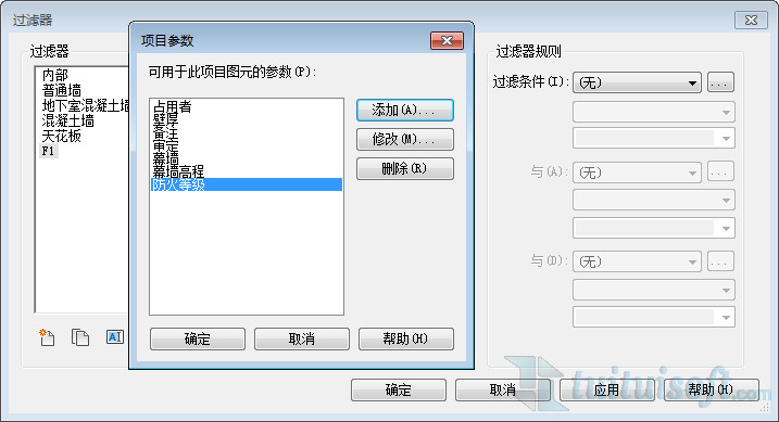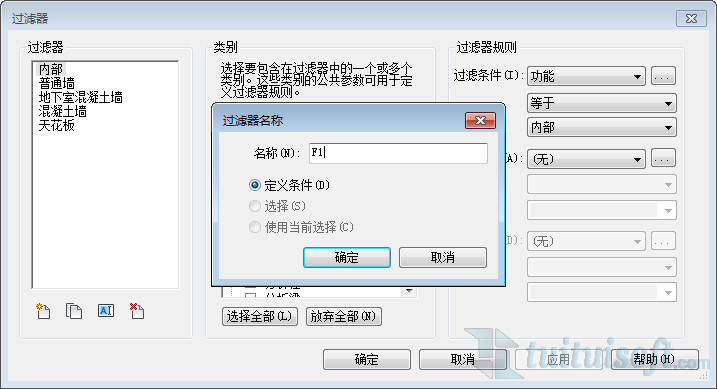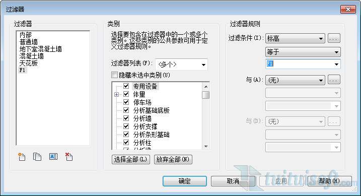 新建完过滤条件之后,就可以在过滤条件下拉选框中选择更多参数,将新添加的“标高”选择进来。并将条件设置为“等于”、“F1”。