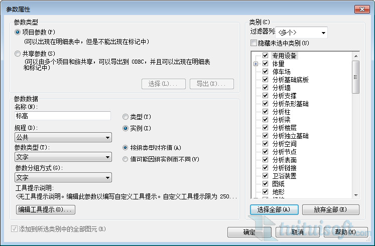 修改名称为“标高”,参数类型为“文字”,并在右侧类别中选择全部。