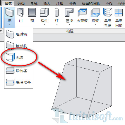 Revit不能直接创建斜墙,但是可以通过内建模型和面墙的方式来创建,下面就来详细的介绍这两种方法!