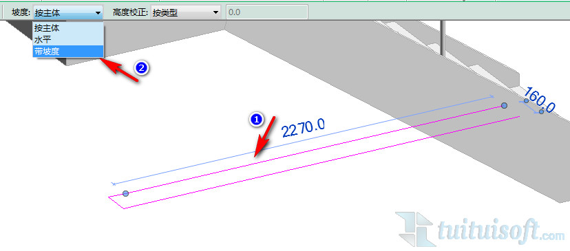 三、继续进入扶手的编辑路径模式中,选择1号箭头指的那条路经,在上方的坡度中选择“带坡度”