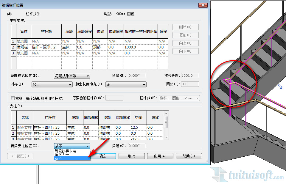 五、最后一步!进入栏杆的类型属性中,将转角支柱位置设置成“从不”,我们就会发现转角处就变正常了