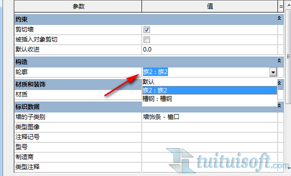 在墙饰条的属性栏中选择“编辑类型”里的构造中的“轮廓”中选择之前做好的踢脚线轮廓族: