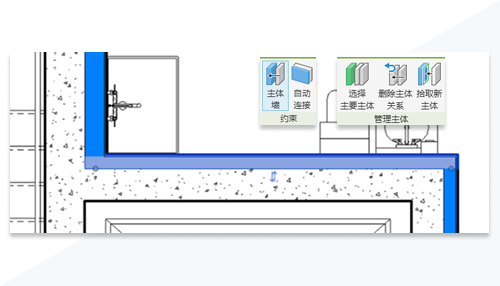 启用主体墙后,可以使用“按房间放置”选择现有墙或使用“按分段放置”选择单面墙来放置主体墙。使用“自动连接”以允许门和窗穿透主体墙和基于主体的墙。